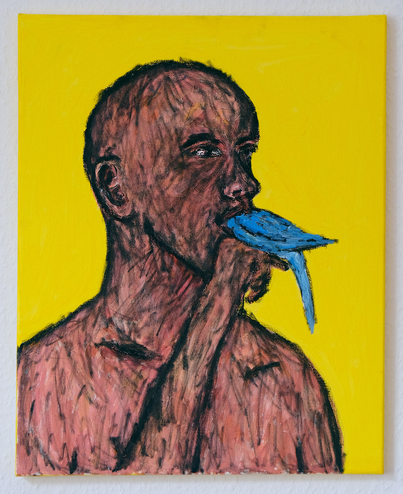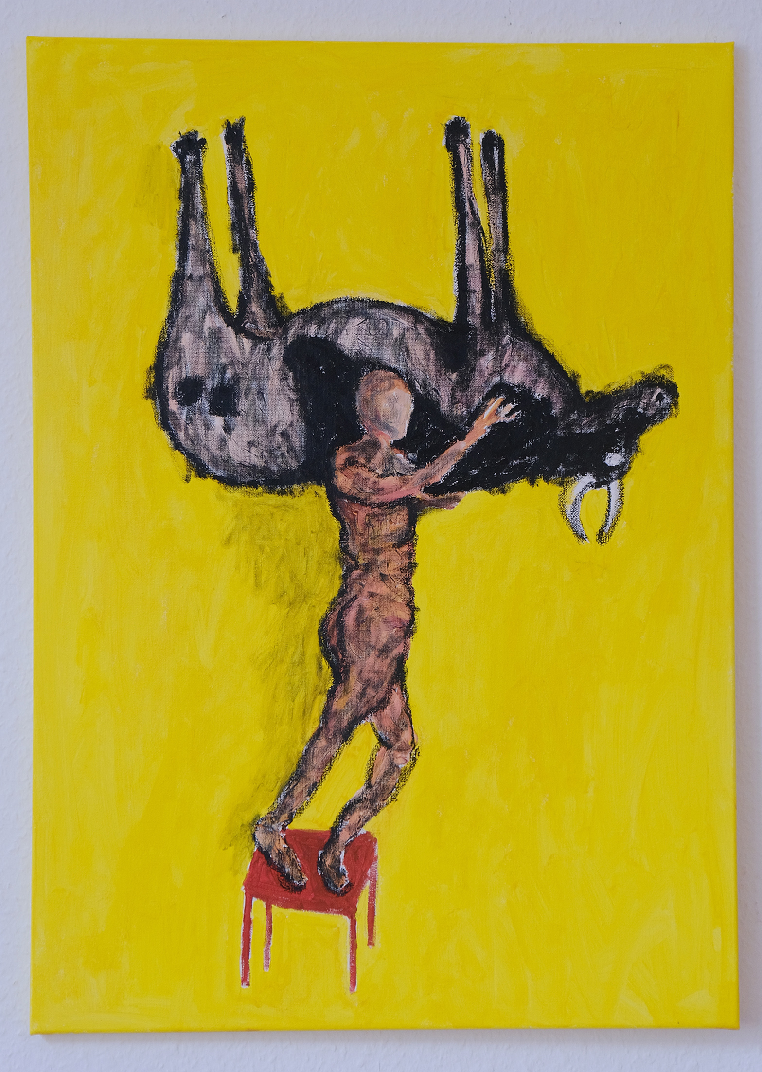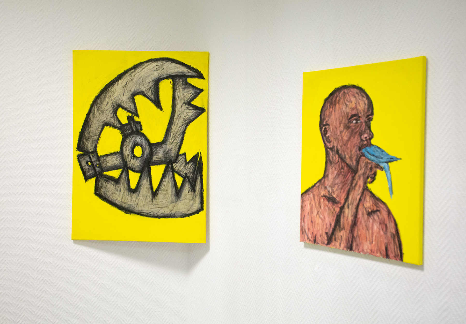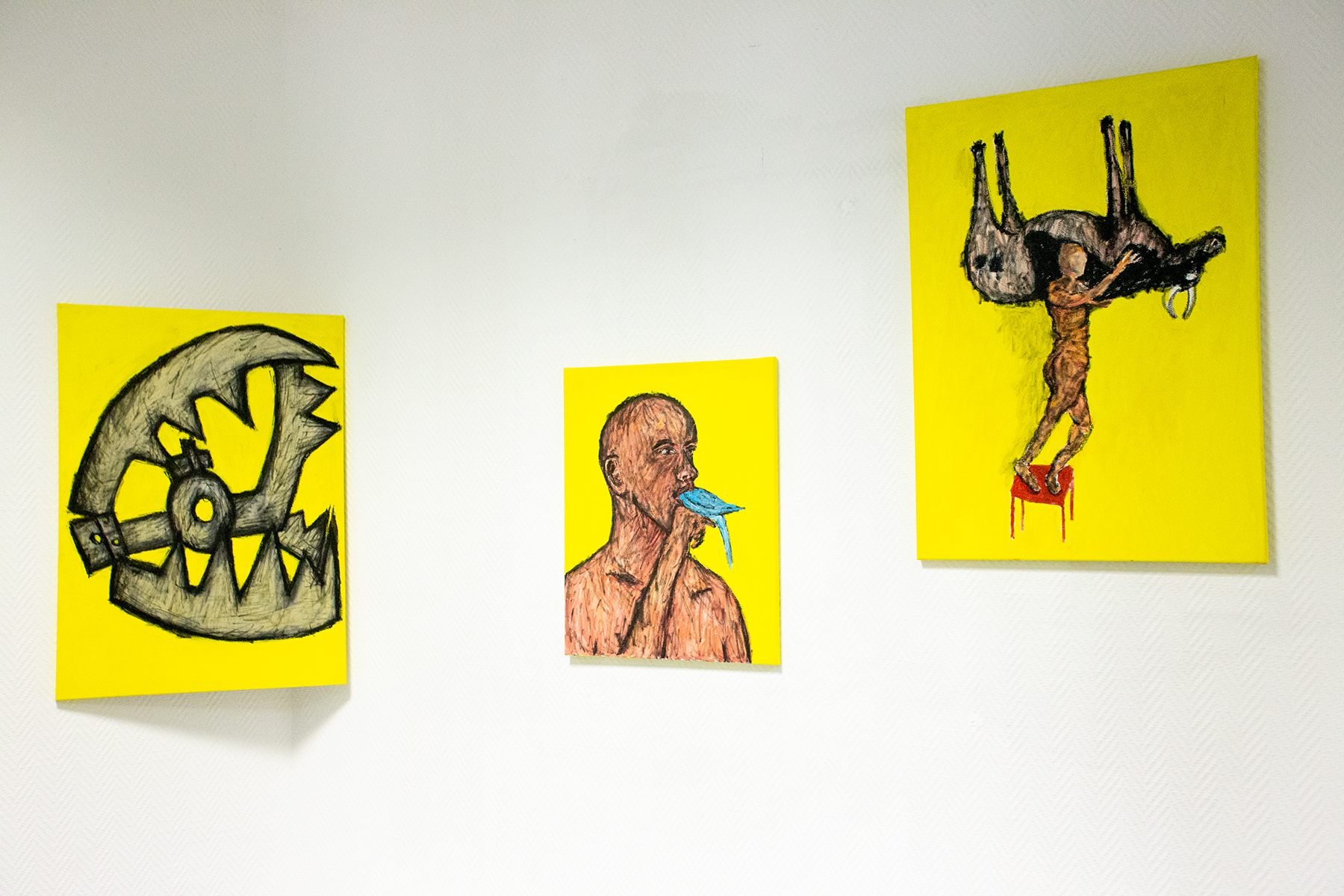 the series consists of three works on a yellow background, united by the theme of inner conflict and mental repression, showing different aspects of a person's struggle with severe internal states: from the feeling of unbearable stress, suppression of expression and desires, to feelings of hopelessness and threat. the works illustrate psychoanalytic concepts of guilt, repressed fear of internal and external destructive mechanisms.
