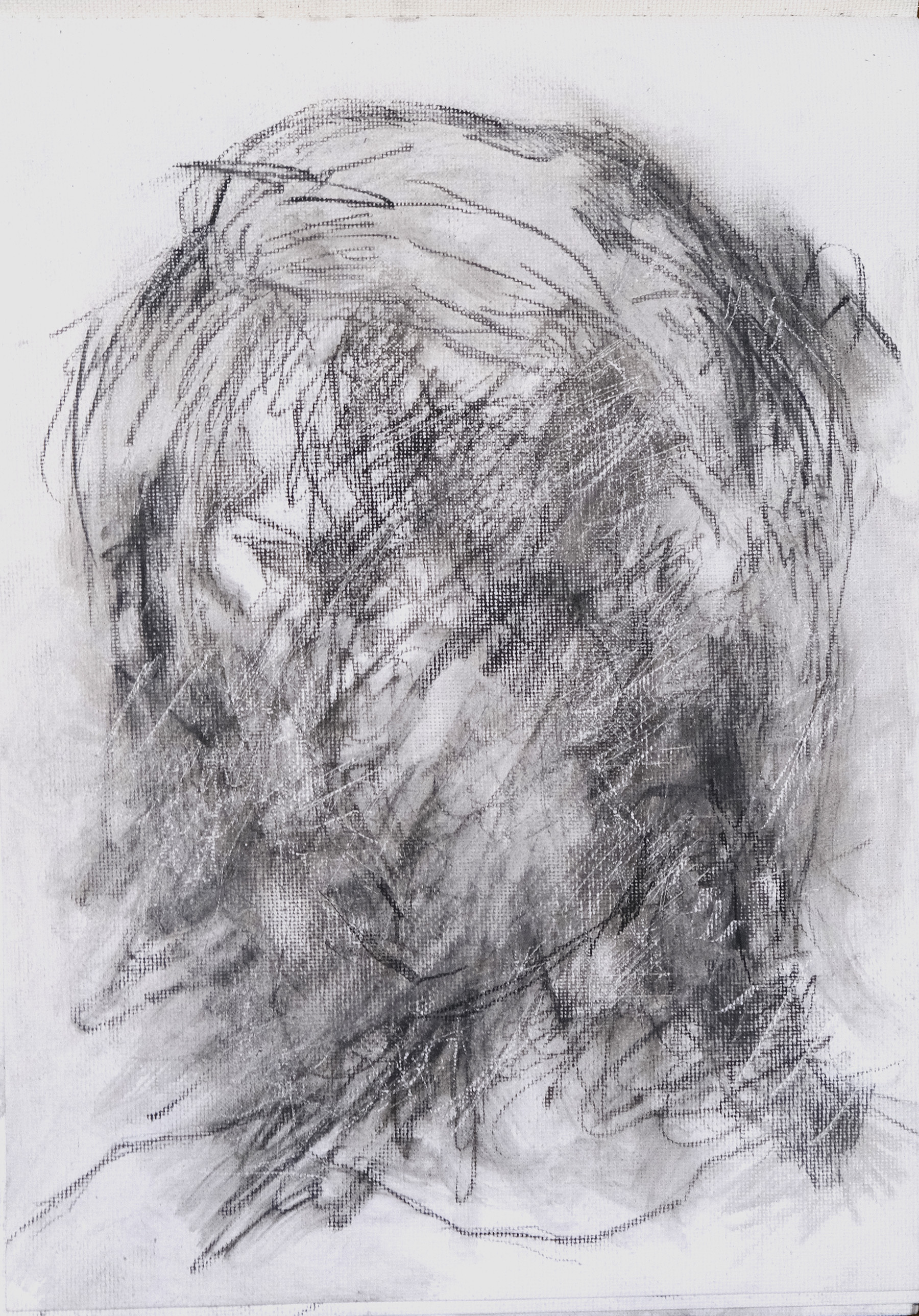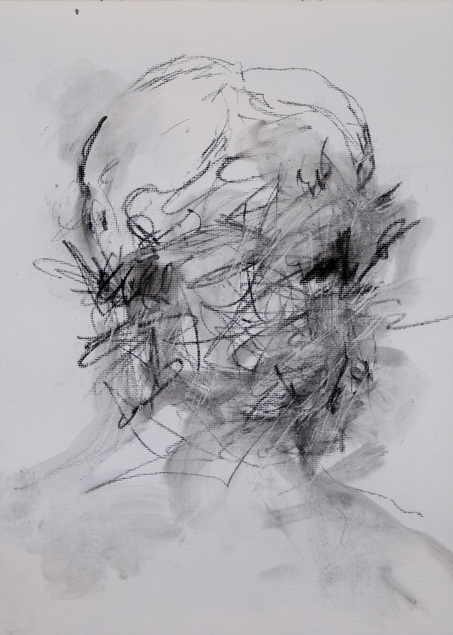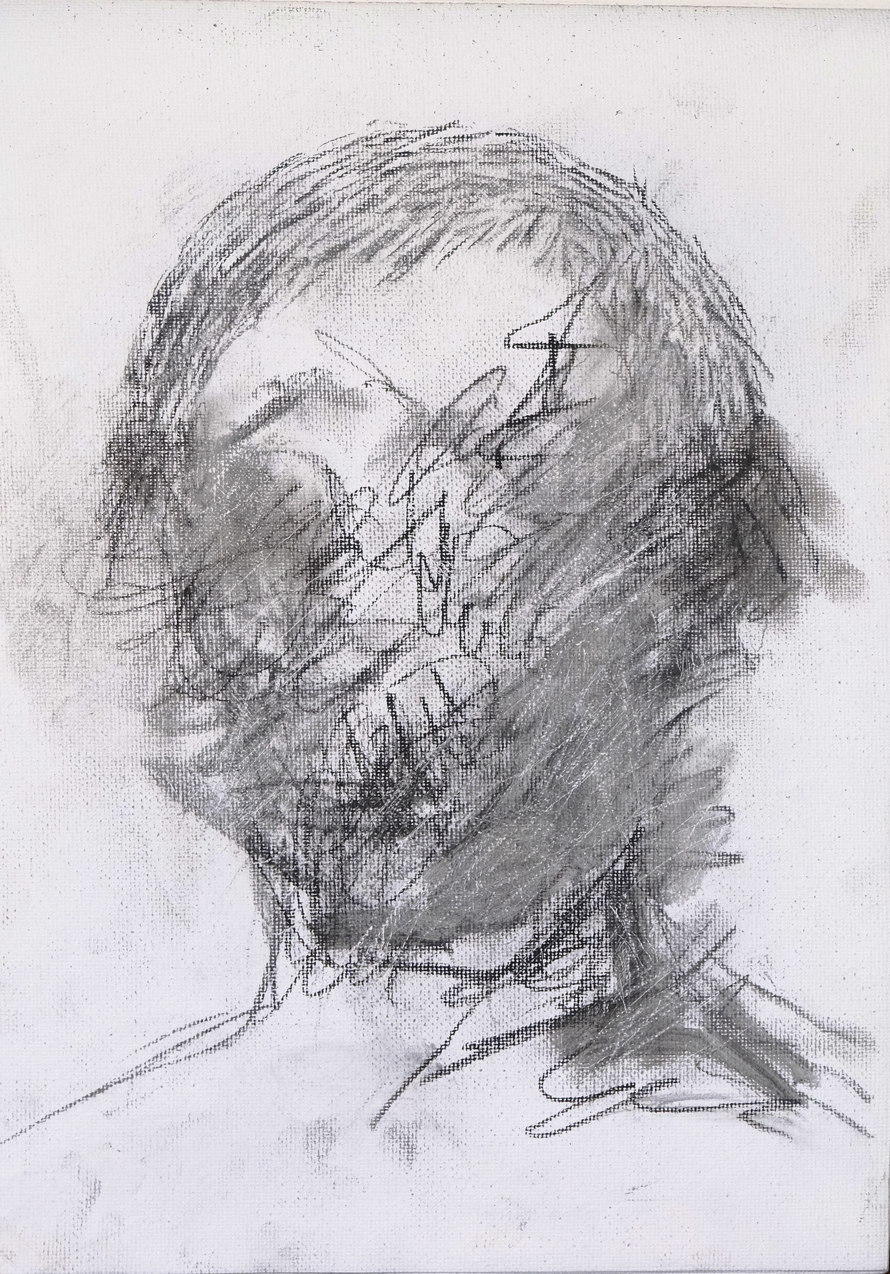 The portraits are made in monochrome graphics with blurred and chaotic lines. the faces lose their features and become mere hints of the human form. an effect of 'erasure' of personality is created, symbolising how fear can destroy the inner sense of self, making it amorphous and unclear. the portraits are a kind of psychological study, focusing on the inner state of a person rather than their outward appearance. the lines, merging and diverging, seem to convey the flow of thoughts and emotions raging inside the man, depriving him of clarity.