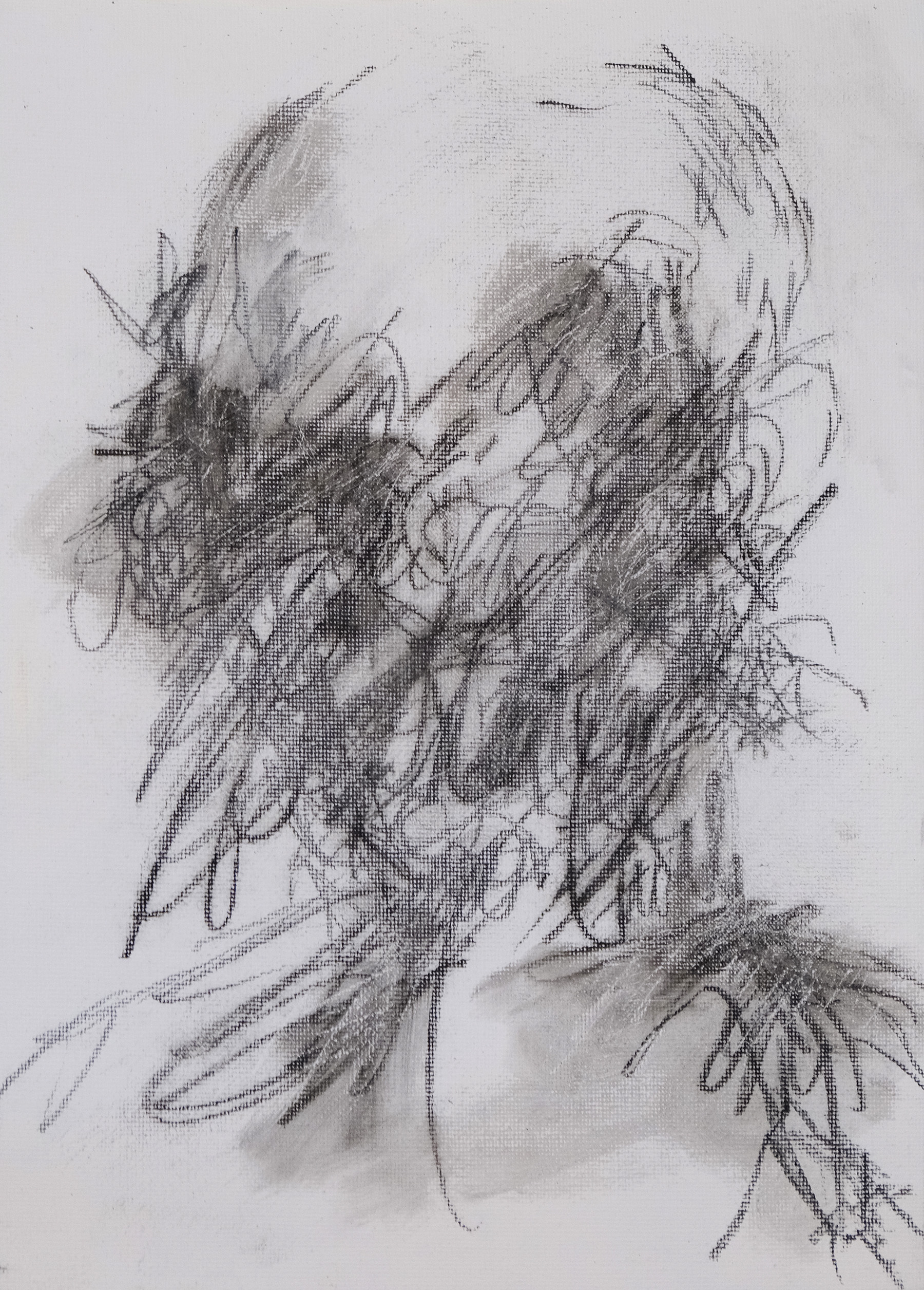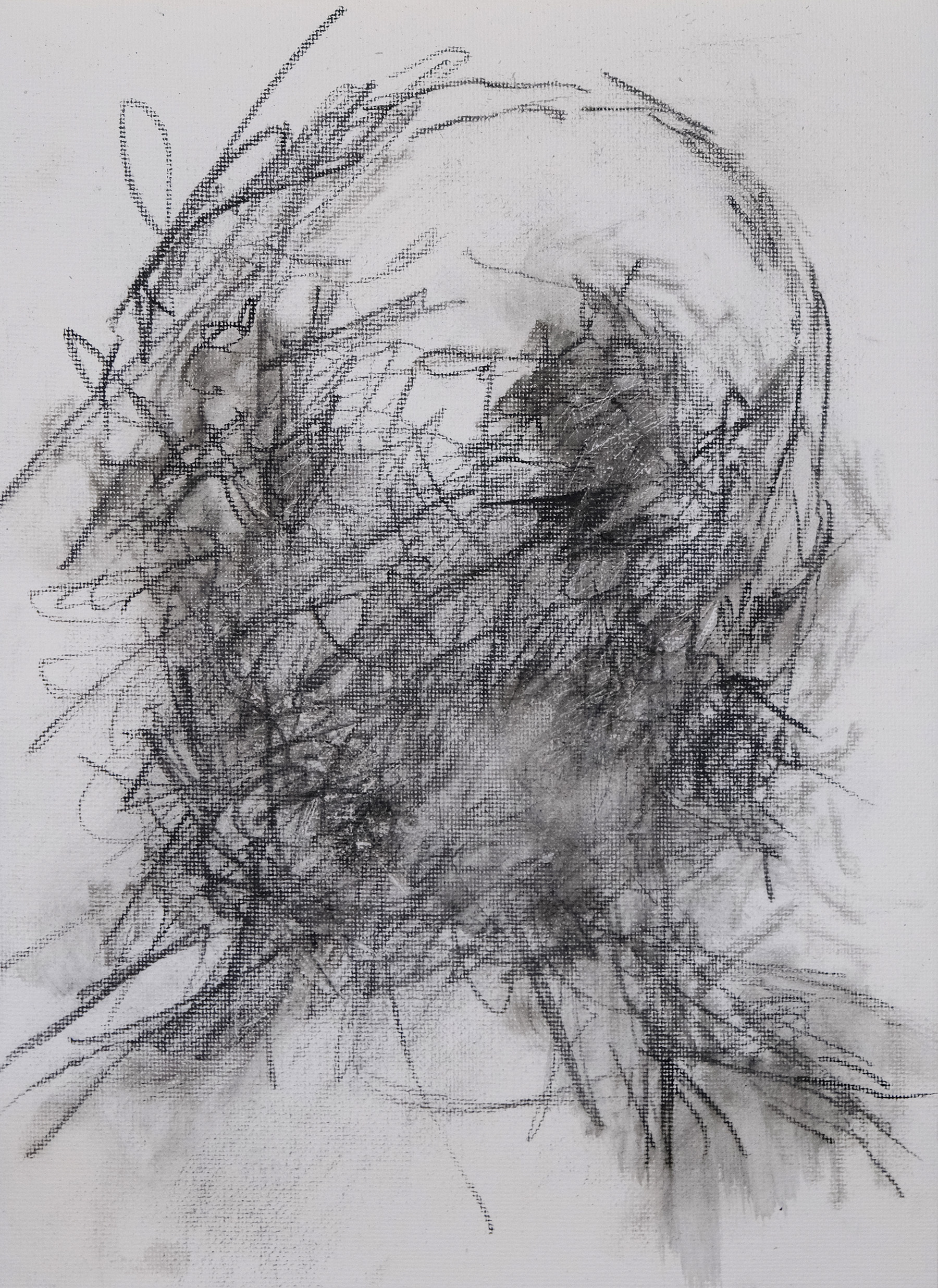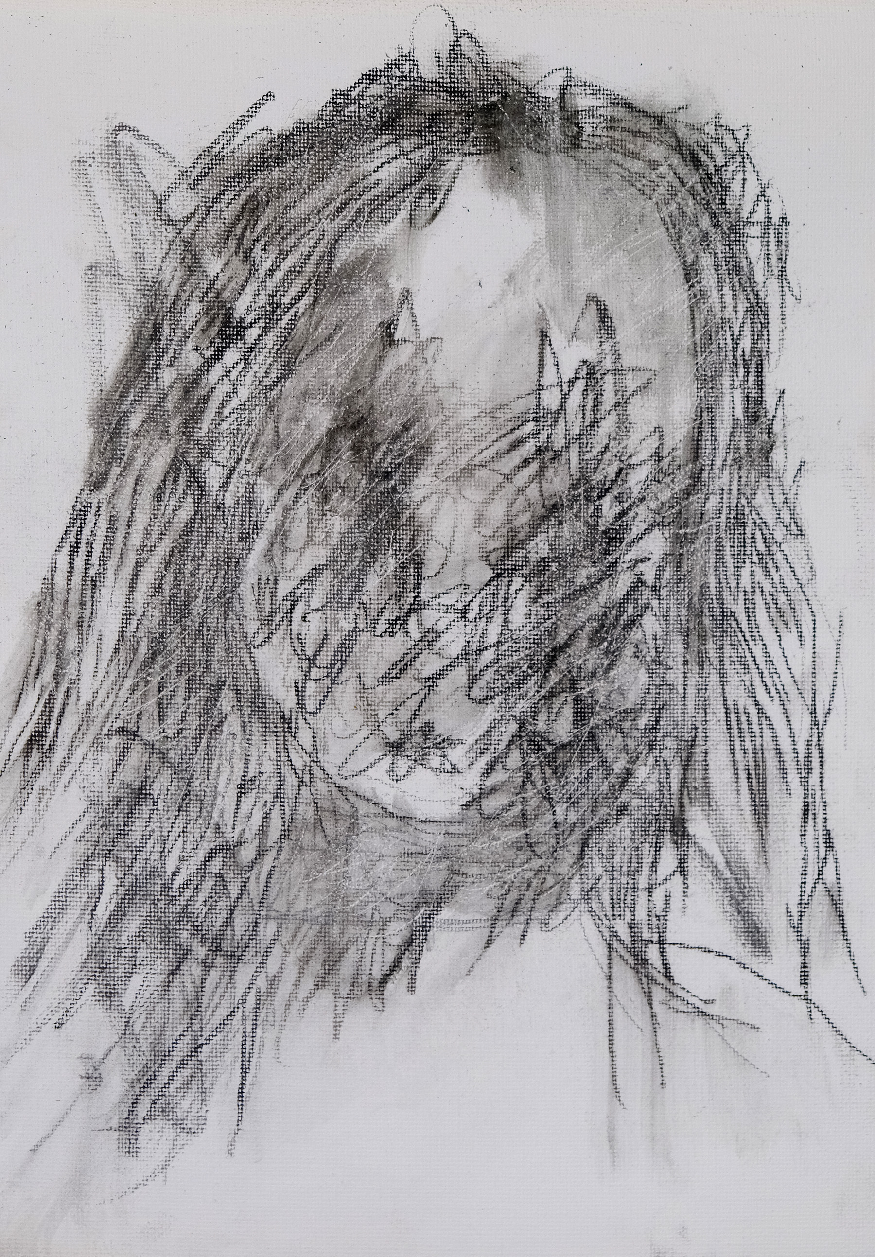 The portraits are made in monochrome graphics with blurred and chaotic lines. the faces lose their features and become mere hints of the human form. an effect of 'erasure' of personality is created, symbolising how fear can destroy the inner sense of self, making it amorphous and unclear. the portraits are a kind of psychological study, focusing on the inner state of a person rather than their outward appearance. the lines, merging and diverging, seem to convey the flow of thoughts and emotions raging inside the man, depriving him of clarity.